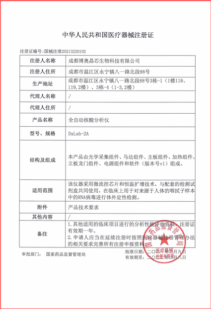 2021年2月10日,恰逢新春佳節(jié)來臨之際,依托國家科技部應(yīng)急攻關(guān)項目,博奧聯(lián)合清華大學(xué)成功研發(fā)的由新型冠狀病毒2019-nCoV核酸檢測試劑盒(全集成碟式芯片法)(國械注準(zhǔn):20213400101)和全自動核酸分析儀(國械注準(zhǔn):20213220102)組成的全集成芯片實驗室獲國家藥監(jiān)局應(yīng)急審批批準(zhǔn),為全國新冠肺炎疫情防控提供現(xiàn)場快速檢測“芯”利器。
