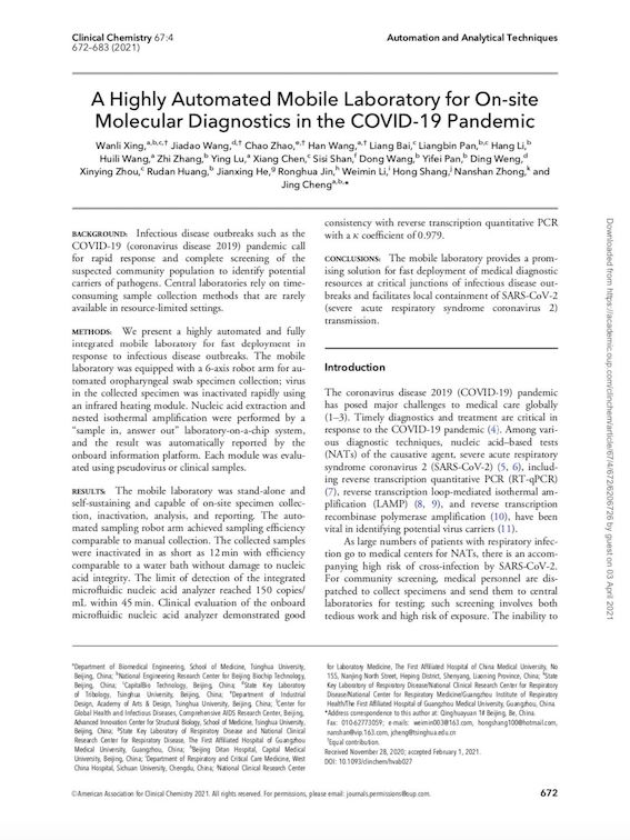 近日,博奧生物集團(tuán)暨生物芯片北京國(guó)家工程研究中心攜手清華大學(xué)、廣州醫(yī)科大學(xué)第一附屬醫(yī)院呼吸系統(tǒng)疾病國(guó)家重點(diǎn)實(shí)驗(yàn)室、國(guó)家呼吸系統(tǒng)疾病臨床研究中心、首都醫(yī)科大學(xué)北京地壇醫(yī)院、四川大學(xué)華西醫(yī)院、中國(guó)醫(yī)科大學(xué)第一附屬醫(yī)院國(guó)家檢驗(yàn)醫(yī)學(xué)臨床研究中心等十多家單位,在國(guó)際檢驗(yàn)醫(yī)學(xué)界權(quán)威雜志Clinical Chemistry,發(fā)表了題為"A Highly Automated Mobile Laboratory for On-site Molecular Diagnostics in the COVID-19 Pandemic"的研究論文,詳細(xì)闡述了“輕騎兵”全集成新冠病毒核酸檢測(cè)移動(dòng)實(shí)驗(yàn)室的性能特點(diǎn)和檢測(cè)能力等成果,得到了國(guó)內(nèi)外廣泛關(guān)注。