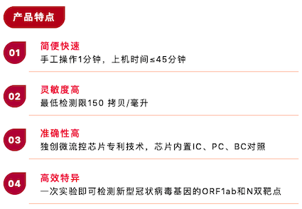 基于全新一代先進的芯片實驗室(Lab-on-a-chip)設(shè)計理念,化繁為簡,檢測時僅需將樣本保存液加入芯片,封閉芯片后即可上機,手工操作小于1分鐘。生物反應全程(包括核酸提取、核酸純化、擴增反應、核酸檢測和結(jié)果判讀等)均集成在一個整體密閉、內(nèi)部分區(qū)的微流控芯片內(nèi),由全自動核酸分析儀完成,因此無需專業(yè)分區(qū)實驗室,無需人工干預,最大程度降低操作人員感染及樣本間交叉污染的風險。45分鐘完成實驗全過程,最快可在35分鐘內(nèi)檢出新冠陽性樣本,檢測靈敏度可達150拷貝/毫升,在截至目前國內(nèi)獲批的同類產(chǎn)品中靈敏度最高,真正實現(xiàn)“樣本進-結(jié)果出”。