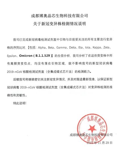 目前,旗下成都博奧晶芯生物科技有限公司已完成新冠病毒檢測試劑盒中引物與目前主要流行變異株的序列比對【包括但不限于:Alpha、Beta、Gamma、Delta、Eta、Iota、Kappa、Zeta、Epsilon、Omicron(B.1.1.529)】,結(jié)果證實:博奧晶典已上市的新型冠狀病毒2019-nCoV核酸檢測試劑盒(全集成碟式芯片法),不會出現(xiàn)脫靶和漏檢的情況。后續(xù),博奧晶典將持續(xù)緊密追蹤全球新冠病毒變異株的最新動態(tài)并及時跟進最新信息,確保全集成新冠病毒核酸檢測芯片試劑盒對變異株檢測的準確性和靈敏性。