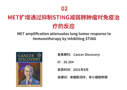 免疫檢查點療法(ICB)已在 NSCLC 患者中表現(xiàn)出一定的治療效果,在總生存期、持久反應(yīng)和良好的安全性方面均有顯著益處。盡管 ICB 已經(jīng)造福于部分癌癥患者,但由于原發(fā)性或繼發(fā)性耐藥的,大多數(shù)患者最終未能對 ICB 治療產(chǎn)生反應(yīng)。本研究通過81名非小細胞肺癌(NSCLC)患者免疫檢查治療(ICB)前后比較發(fā)現(xiàn) MET 擴增的患者對 ICB 耐藥,利用單細胞轉(zhuǎn)錄組測序發(fā)現(xiàn)肝細胞生長因子受體(MET)擴增通過 UPF1 蛋白降低了 STING 的表達,弱化了 IFN 反應(yīng),影響了抗腫瘤免疫的產(chǎn)生。而 MET 抑制劑與抗 PD-1 抑制劑聯(lián)合使用,能增強抗腫瘤免疫,有助于腫瘤消退。本研究首次表明 MET 拷貝數(shù)是影響肺癌患者對 ICB 反應(yīng)的一個關(guān)鍵因素,并有希望快速轉(zhuǎn)化到臨床應(yīng)用中。