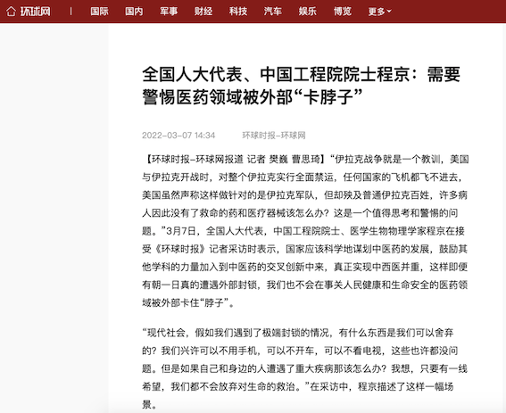 “伊拉克戰(zhàn)爭就是一個教訓(xùn),美國與伊拉克開戰(zhàn)時,對整個伊拉克實行全面禁運,任何國家的飛機(jī)都飛不進(jìn)去,美國雖然聲稱這樣做針對的是伊拉克軍隊,但卻殃及普通伊拉克百姓,許多病人因此沒有了救命的藥和醫(yī)療器械該怎么辦?這是一個值得思考和警惕的問題。”3月7日,全國人大代表,中國工程院院士、醫(yī)學(xué)生物物理學(xué)家程京在接受《環(huán)球時報》記者采訪時表示,國家應(yīng)該科學(xué)地謀劃中醫(yī)藥的發(fā)展,鼓勵其他學(xué)科的力量加入到中醫(yī)藥的交叉創(chuàng)新中來,真正實現(xiàn)中西醫(yī)并重,這樣即便有朝一日真的遭遇外部封鎖,我們也不會在事關(guān)人民健康和生命安全的醫(yī)藥領(lǐng)域被外部卡住“脖子”。