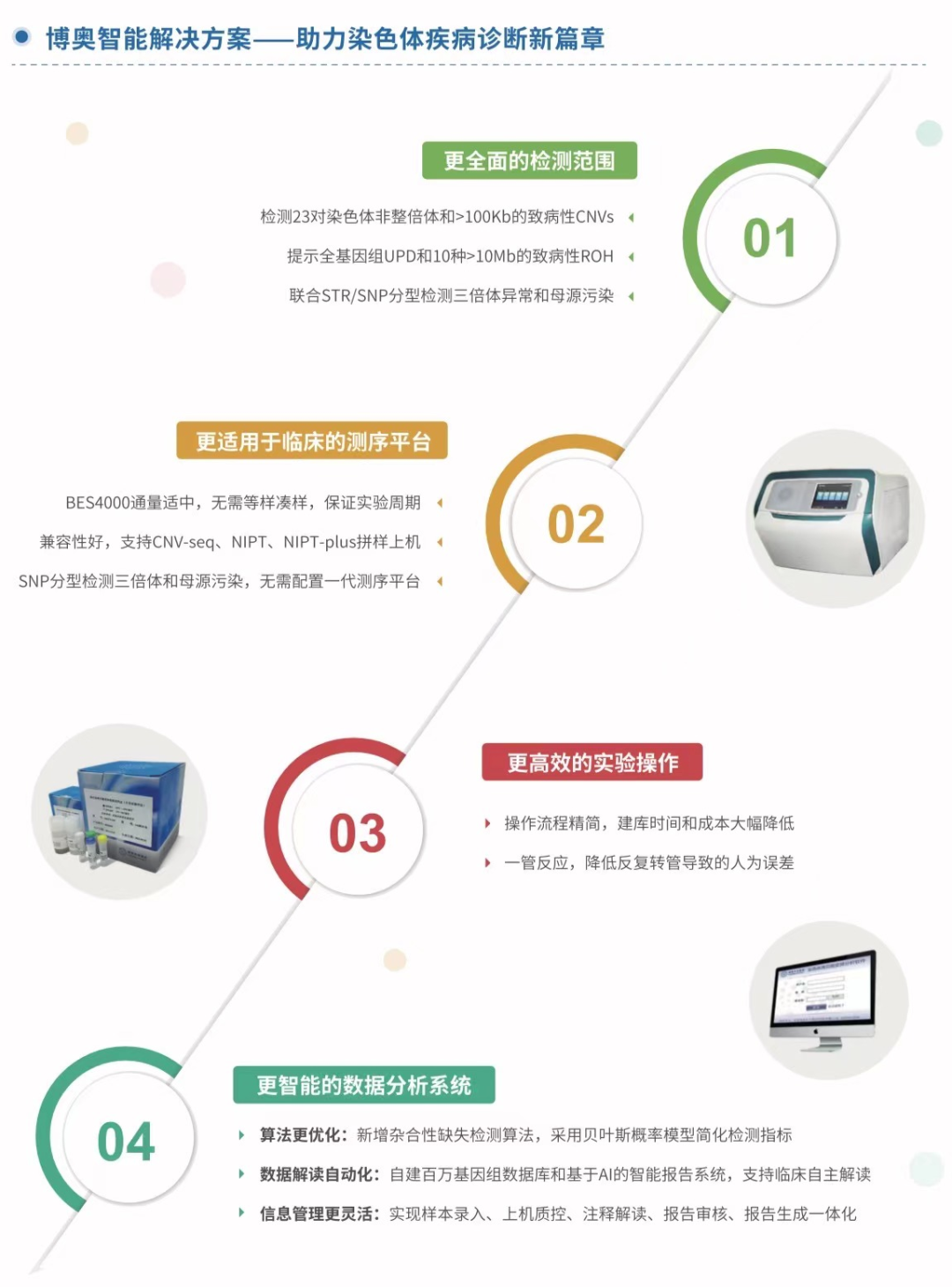 為助力臨床精準(zhǔn)診斷,博奧晶典在常規(guī)CNV-seq檢測23對染色體非整倍體和>100Kb染色體拷貝數(shù)變異的基礎(chǔ)上進行優(yōu)化升級,同步推出檢測試劑盒(RUO)和LDT檢測服務(wù)。CNV-seq plus不僅能實現(xiàn)特定UPD檢測、三倍體檢測和母源污染鑒定,還能為臨床提供本土化樣本檢測、數(shù)據(jù)解讀和報告生成的一體化解決方案,進一步助力臨床提高診療效率。
