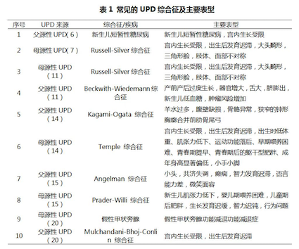 大多數(shù)染色體UPD沒有臨床表型,當(dāng)UPD發(fā)生在印記基因區(qū)域則會導(dǎo)致印記基因異常,出現(xiàn)異常的表型。目前針對上述UPD綜合征(表1)尚無有效的治療手段,因此,早發(fā)現(xiàn)、早診斷、早干預(yù)對于此類疾病的防控尤為重要。