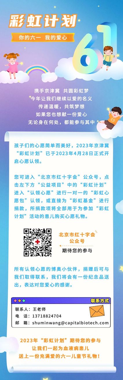 “彩虹計劃”是幫助血液病患兒實現(xiàn)兒童節(jié)心愿的公益活動。在中華骨髓庫北京分庫(現(xiàn)北京市紅十字會捐獻(xiàn)服務(wù)中心)和北京市造血干細(xì)胞捐獻(xiàn)志愿者協(xié)會的共同努力下,“彩虹計劃”已發(fā)展成為北京市紅十字會的人道公益品牌項目,并從2016年起聯(lián)合京津冀三地,以“攜手京津冀 共圓彩虹夢”為主題,通過三地骨髓庫、志愿者共同策劃、同步宣傳的形式,幫助血液病患兒實現(xiàn)他們“六一”小心愿。活動開展以來取得了很好的效果,在全社會弘揚了人道、博愛、奉獻(xiàn)的紅十字精神,得到社會各界的大力支持和幫助,受到醫(yī)院、患兒和家屬的一致好評和社會愛心人士的廣泛關(guān)注,促進(jìn)了京津冀地區(qū)公益事業(yè)多形式的開展和發(fā)展,帶動了京津冀三地造血干細(xì)胞事業(yè)的向前發(fā)展。