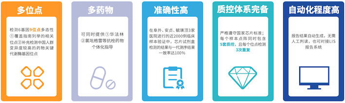 抗栓治療用藥相關(guān)6個(gè)基因位點(diǎn)多態(tài)性檢測試劑盒(微陣列芯片法)采用多重等位基因序列特異性PCR結(jié)合通用微陣列芯片(Allele-Specific PCR-based Universal Array,ASPUA)方法,對人基因組DNA中VKORC1、CYP2C9、CYP4F2、GGCX、CYP2C19和CYP3A4這6個(gè)基因的9個(gè)多態(tài)性位點(diǎn)進(jìn)行檢測。