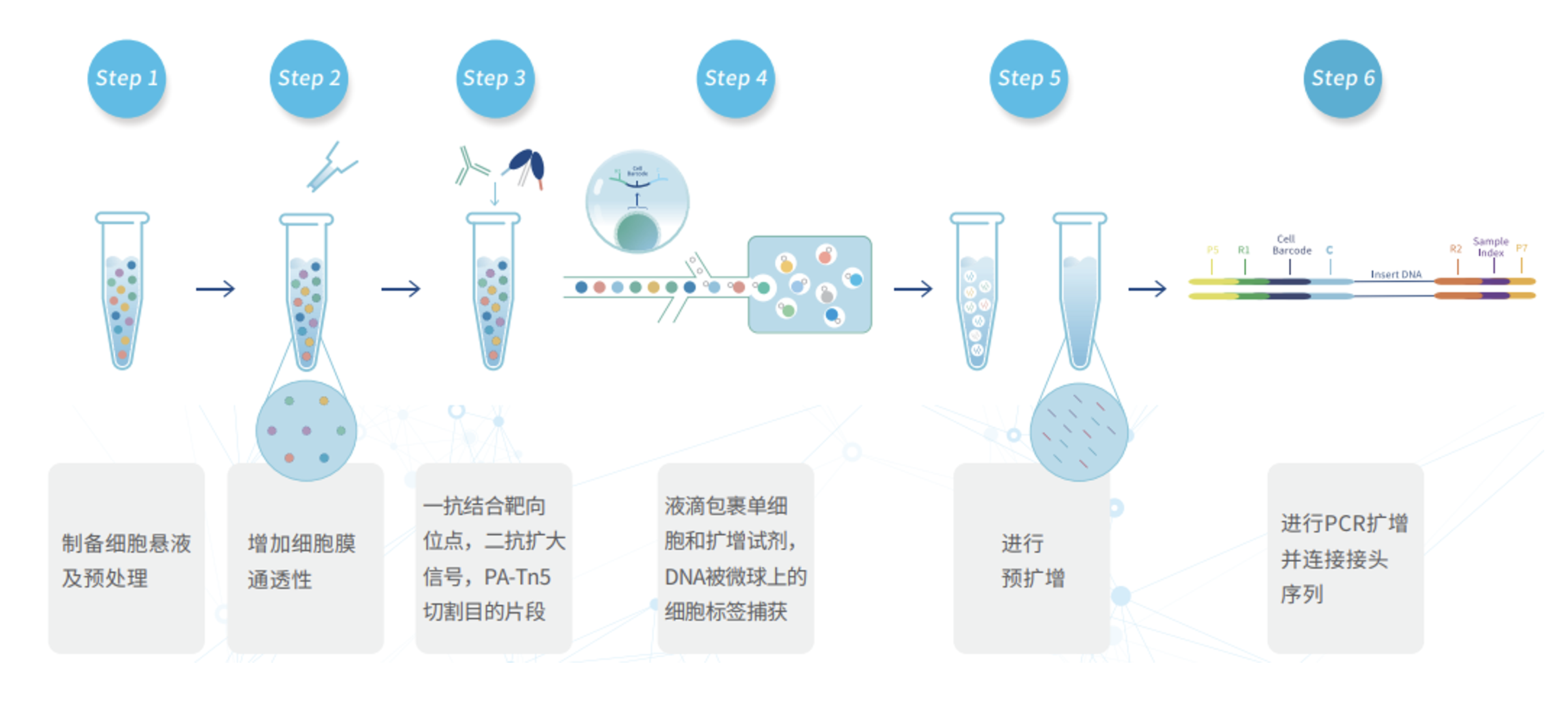 本試劑盒通過抗體和 Tn5 酶識別蛋白與 DNA 的結(jié)合位點(diǎn),并靶向切割 DNA 分子?;谝旱挝⒘骺丶夹g(shù)將經(jīng)過處理的單個細(xì)胞包裹形成油包水結(jié)構(gòu),并借助帶有細(xì)胞標(biāo)簽的微球捕獲 DNà 片段和標(biāo)記 DNA 分子,實(shí)現(xiàn)蛋白與 DNA 位點(diǎn)結(jié)合的測序,具有高通量、超高分辨率、超強(qiáng)特異性的特點(diǎn)。目前提供的檢測抗體:可選5種組蛋白修飾:H3K27ac、H3K4me1、H3K4me3、H3K27me3H3K36me3;1DNA結(jié)合蛋白:Rpb1RNA聚合酶 Ⅱ)