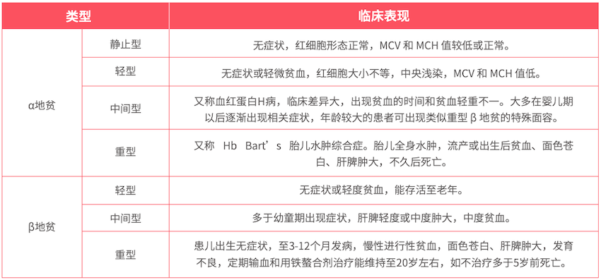 地中海貧血(簡稱”地貧”),是由于遺傳基因發生缺陷,導致紅細胞血紅蛋白合成異常,紅細胞容易破裂,壽命縮短,引起溶血性貧血,是我國南方常見和危害較大的遺傳病之一。常見的地貧類型:α-地貧和β-地貧。根據病情的輕重,又可分為:重型、中間型、輕型、靜止型。