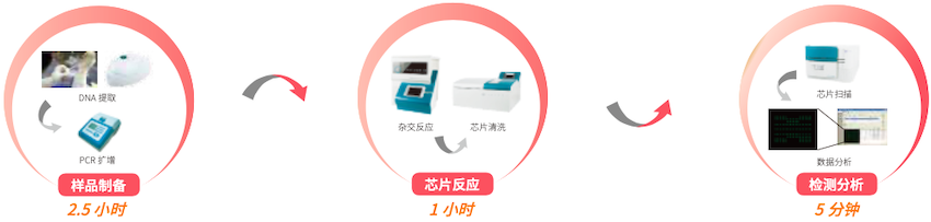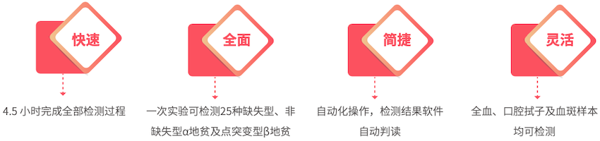 地中海貧血基因檢測試劑盒(微陣列芯片法)采用多重等位基因特異性 PCR 與通用芯片的技術對中國人最常見的地中海貧血基因突變位點及缺失片段進行檢測。可一次性同時完成 α- 和 β- 地中海貧血基因共 25 種突變的檢測,檢測結果可以輔助臨床診斷,也可用于流行病學調查、婚 檢及新生兒檢測等領域。