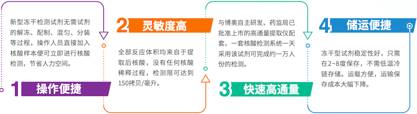 ? ? ? 本試劑盒基于RT-PCR技術,將擴增反應所用的緩沖液、酶、引物、探針混合到凍干微球中,采用96孔板或八連排管預裝凍干微球,在反應孔中直接加入提取后的核酸樣本進行檢測,各樣本之間的檢測結果互不干擾,獨立性好,結果準確,可一次分別實現對新型冠狀病毒ORF1ab基因和N基因的檢測。(國械注準:20223401469)